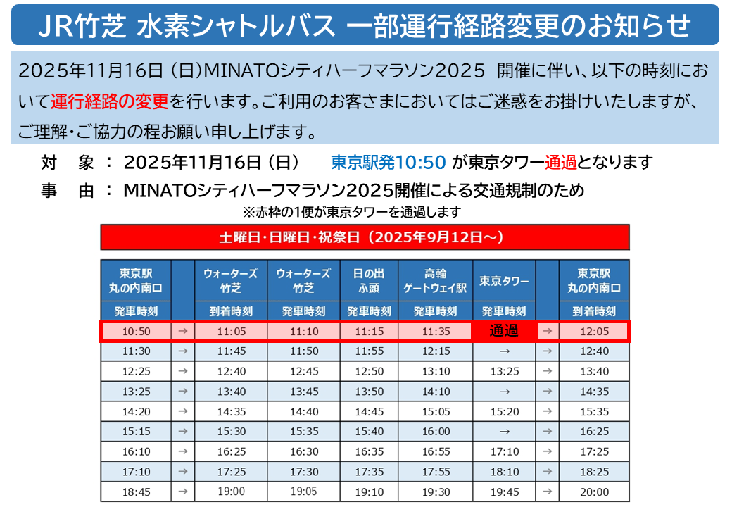 2025年11月16日(日) JR竹芝 水素シャトルバスの一部便で「東京タワー」バス停を通過して運行します