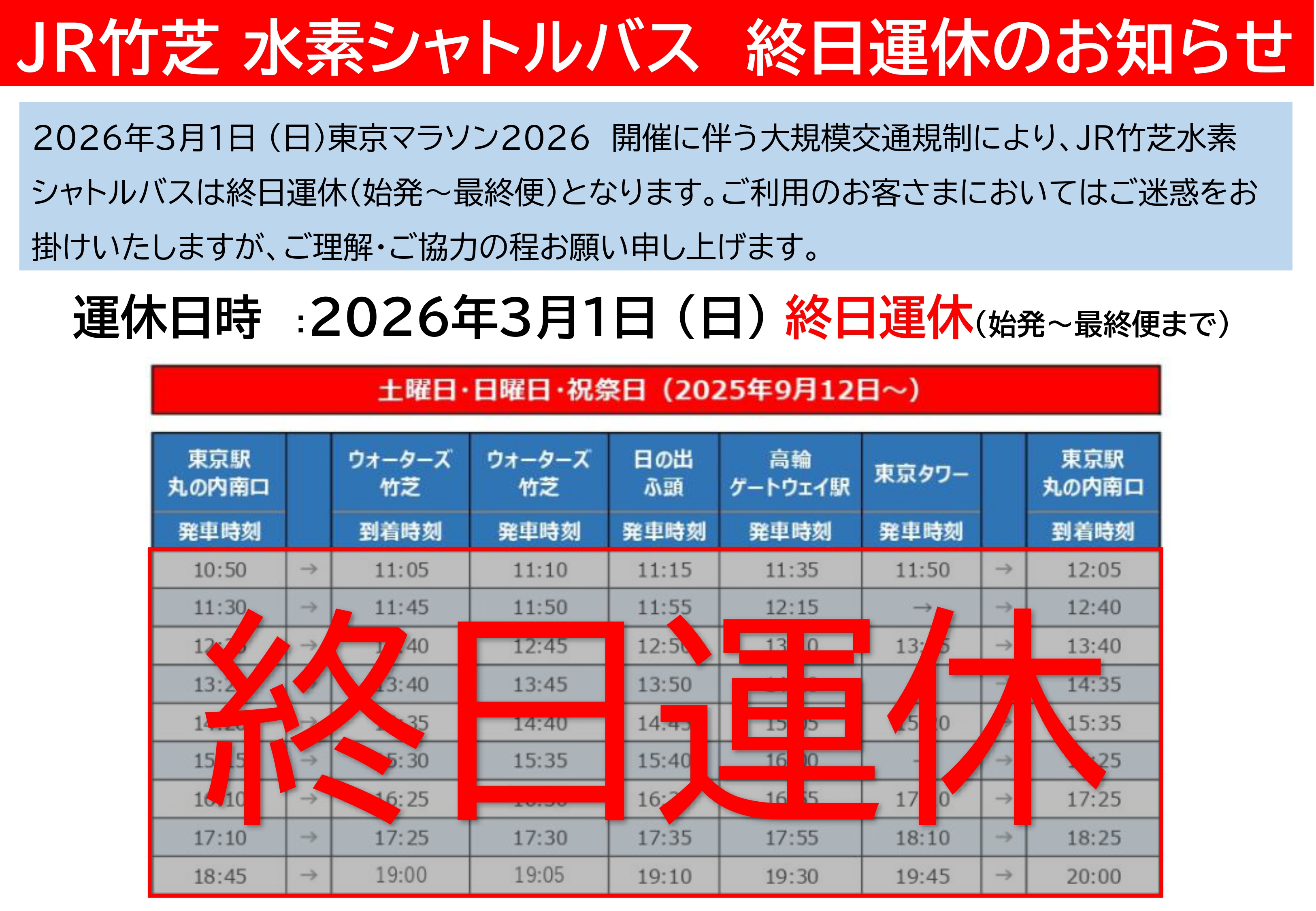 ジェイアールバス関東 HOME > トピックス > 【 JR竹芝 水素シャトルバス】2026年3月1日 全便運休のお知らせ