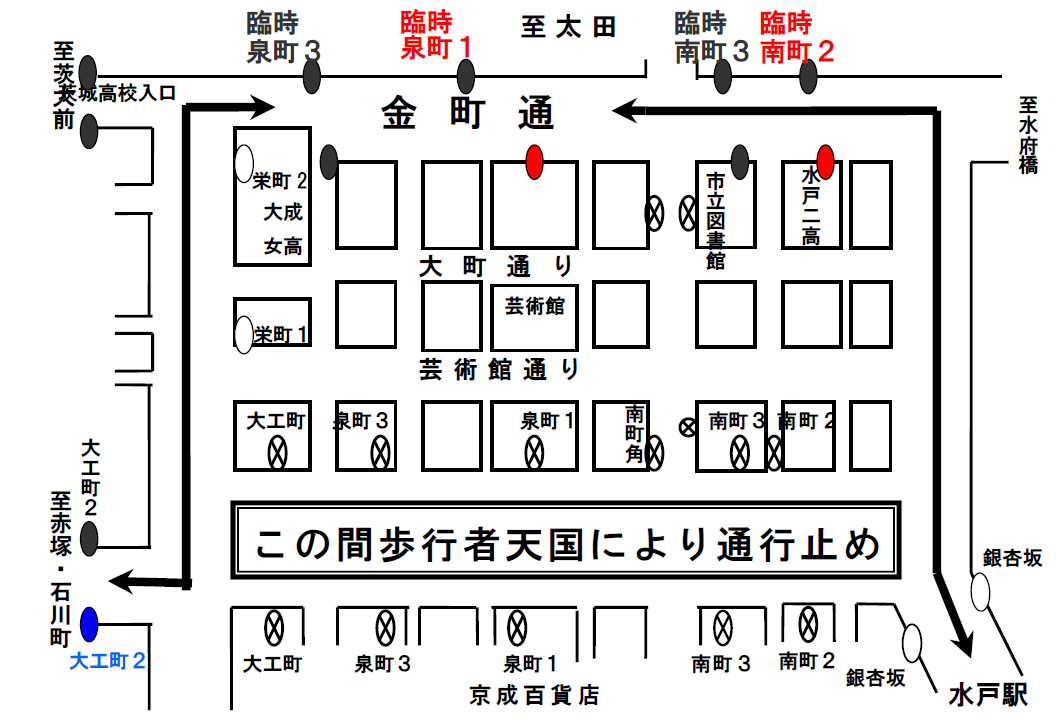 - ・水戸中央郵便局前から大工町交差点の間が交通規制となりますので、上記時間帯は金町通りを経由して運行します。
